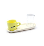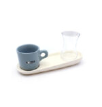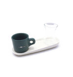 ▪ سینی از سرامیک لعابخورده با بافت نرم و قابل شستوشورنگبندی خاص: فنجان به رنگ سبز یشمی تیره، بسیار خاص و چشمنواز – مناسب دکور مینیمال یا کافهای