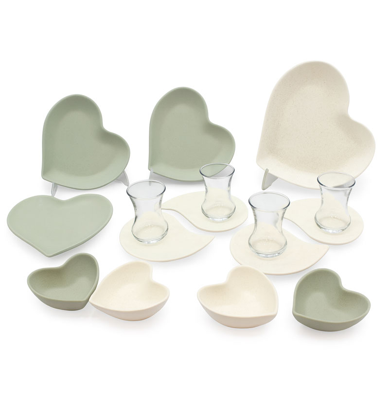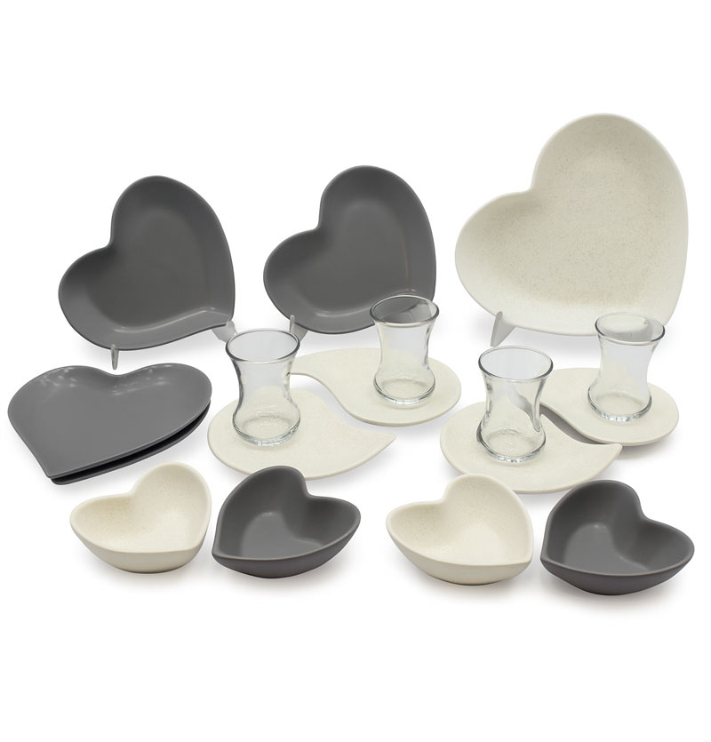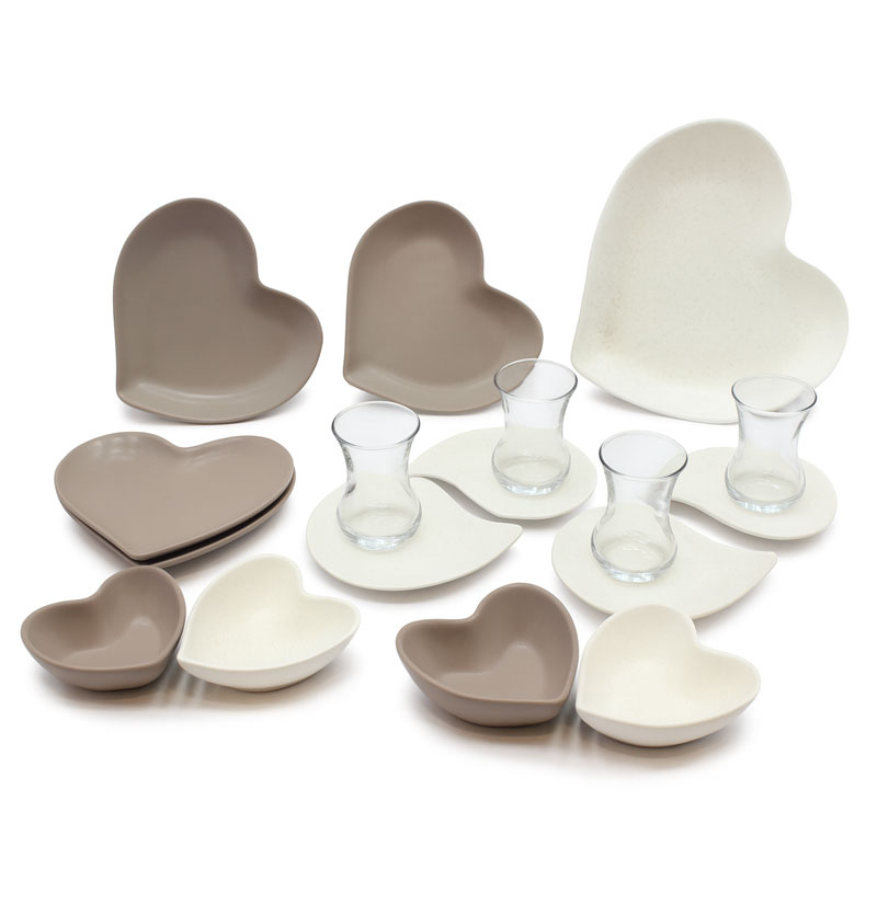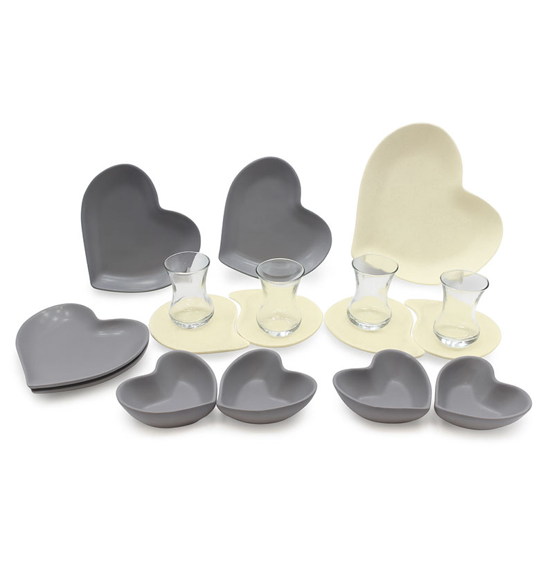 فرم قلبی بشقابها، پیشدستیها و پیالهها ظاهر سرویس را به مجموعهای شیک و رومانتیک تبدیل کرده است.