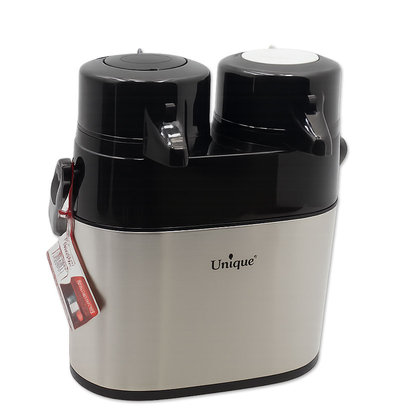 فلاسک دو قلو یونیک (Unique Twin Airpot 9030) ترکیبی از طراحی مدرن، کارایی بالا و کیفیت ساخت بینظیر است. این مدل با ظرفیت کلی ۲ لیتر (۱ + ۱ لیتر)، گزینهای فوقالعاده برای خانوادهها، مهمانیها و دفاتر کاری است.