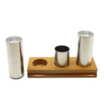 نمکپاش استیل جفتی با جا خلالی یکی از پرکاربردترین و زیباترین لوازم سرو غذا برای استفاده در منزل، رستوران و کافیشاپها است. این ست شامل دو نمکپاش استیل با طراحی استوانهای مدرن و یک محفظه مخصوص خلالدندان میباشد که همگی روی یک پایهی چوبی شیک قرار گرفتهاند.