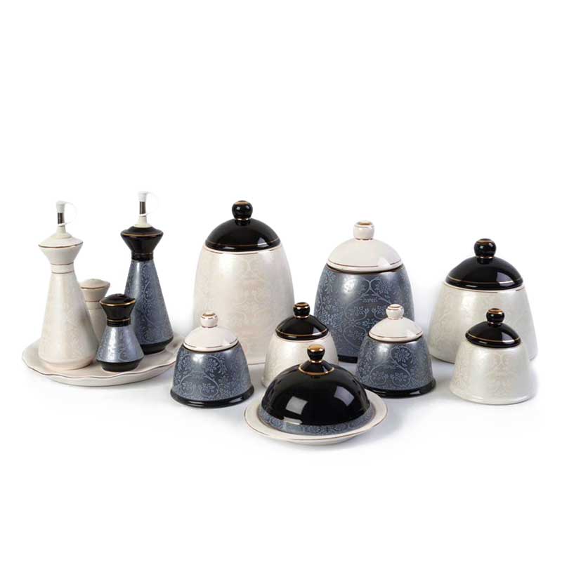 ست کامل آشپزخانه: شامل پاسماوریهای بزرگ و کوچک، ادویهدانها، روغنریز و کرهخوری.