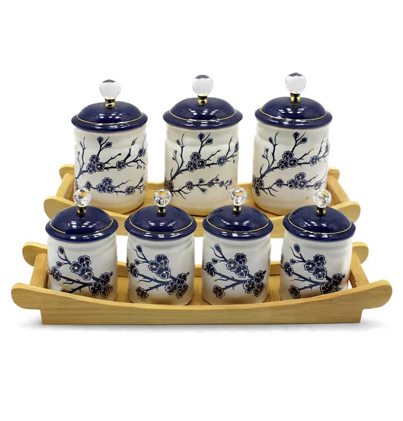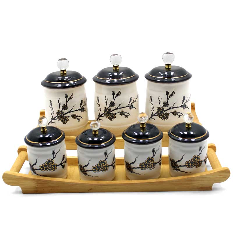 ست پاسماوری بهار ۷ پارچه یکی از شیکترین و کاربردیترین سرویسهای ادویه و حبوبات است که با طراحی خاص، کیفیت بالا و استند چوبی مقاوم، به آشپزخانه شما نظم و زیبایی میبخشد. این مجموعه با بدنه سرامیکی لعابدار، طرح گل طلایی و دربهای مشکی با دستگیره کریستالی، جلوهای کاملاً لوکس و چشمنواز ایجاد میکند.